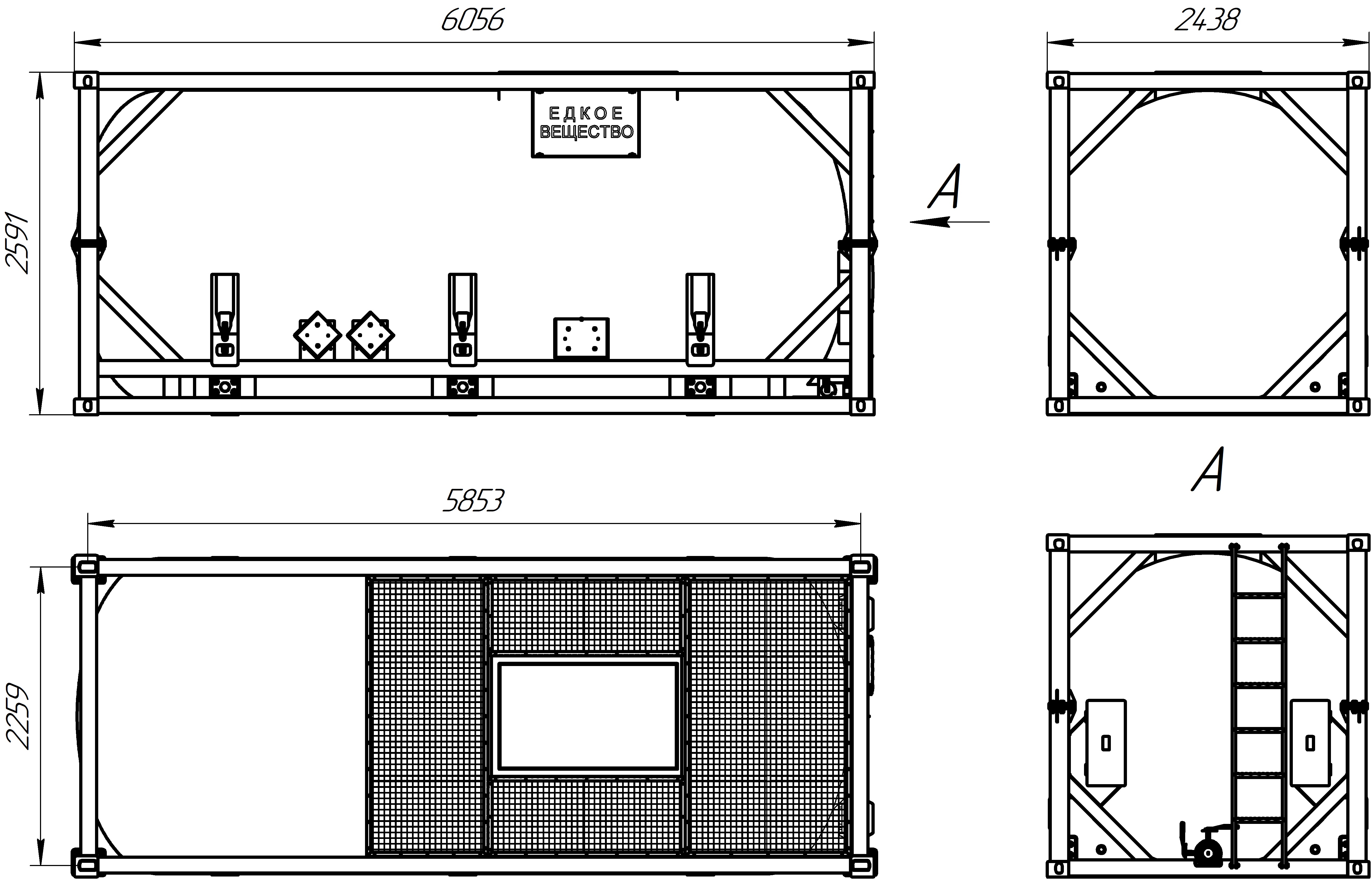 | Стандартное оснащение: | Заливная горловина, дыхательный клапан, сливной кран в защитном коробе, волногасители, люк-лаз, лестница, площадка для обслуживания,металлическая защитная рама с контейнерными замками. |