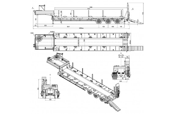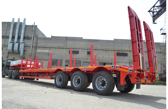 45000 кг, шины 445/65R22,5 или 395/85R20 / 6+1, платформа 10300 (11080 до трапов) x 2500 с уширителями до 3000 мм, механические трапы, ССУ 1510 мм, рессорная подвеска, съемные стойки 1500 мм