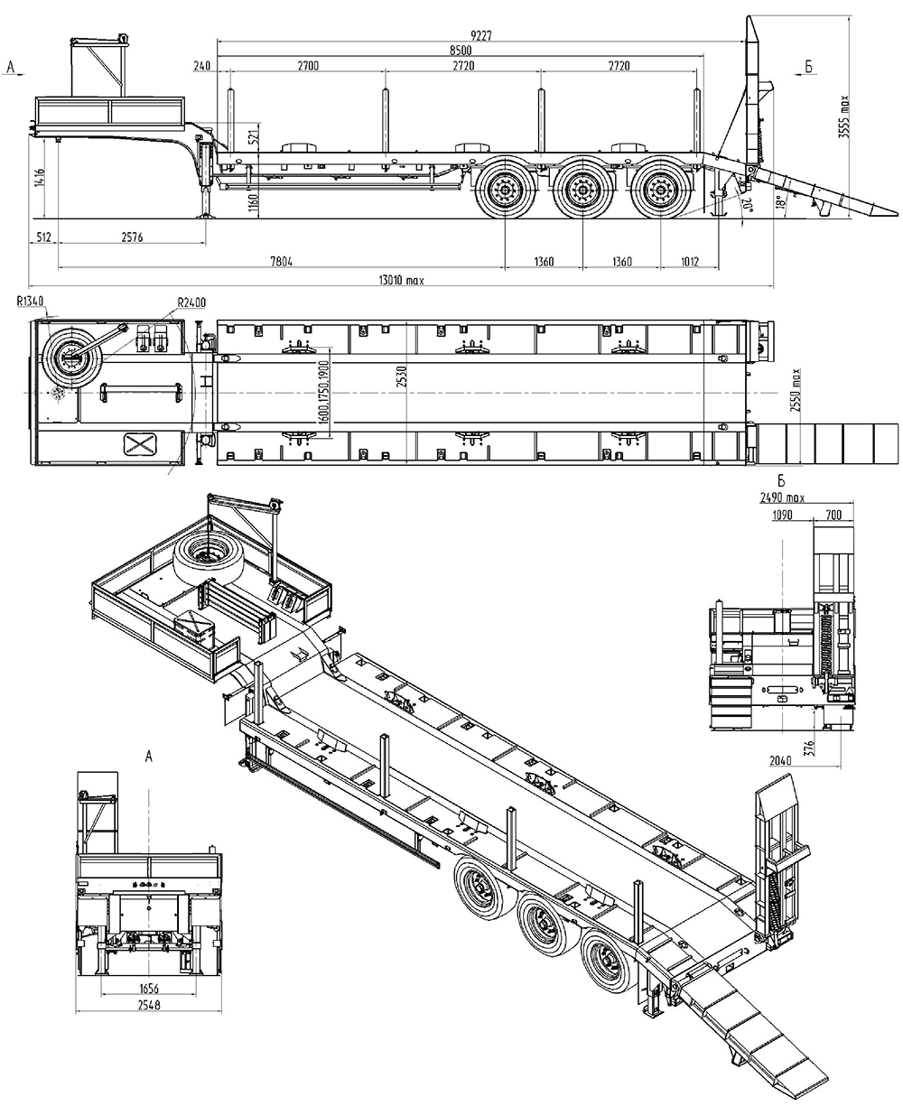 31600 кг, шины 385/65R22,5/6+1, платформа 8500 (9227 до трапов) x 2530 с уширителями до 3030 мм, ССУ 1416 мм, рессорная или пневматическая подвеска, съемные стойки