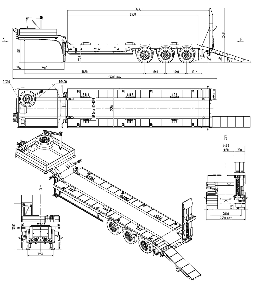 39000 кг, шины 385/65R22,5 или 445/65R22,5 / 6+1, платформа 11080 до трапов) x 2500 с уширителями до 3000 мм, ССУ 1510 мм, пневматическая или рессорная подвеска, съемные стойки 1500 мм, механические трапы