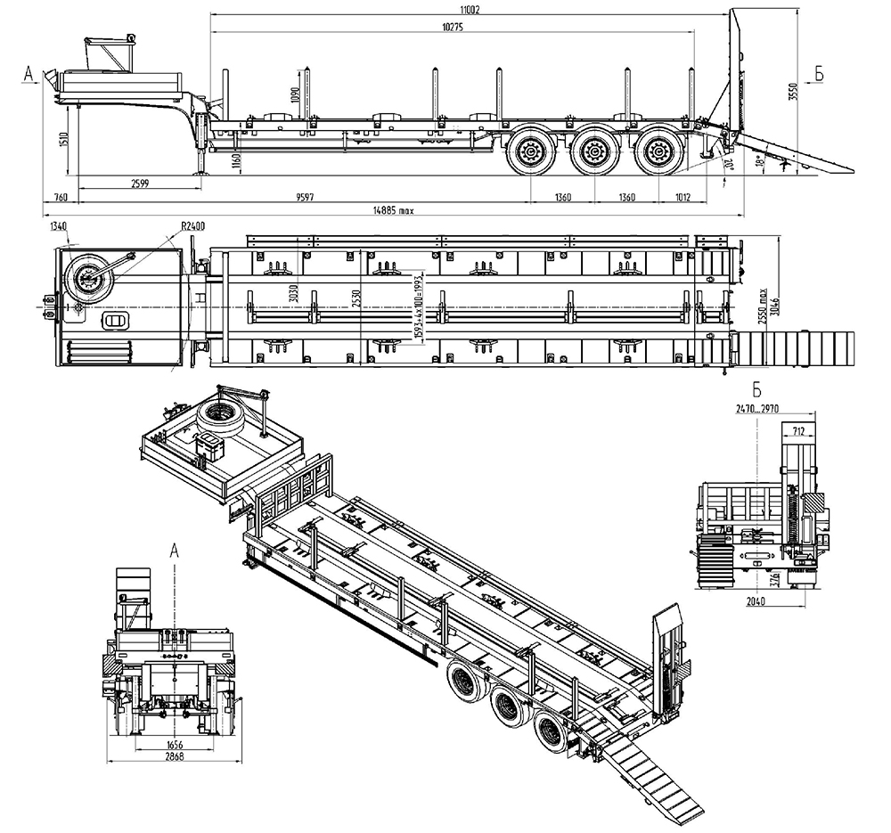 29700 кг, шины 385/65R22,5/6+1, платформа 11000 (11725 до трапов) x 2530 с уширителями до 3030 мм, ССУ 1410-1510 мм, рессорная или пневматическая подвеска, съемные стойки, передний щит