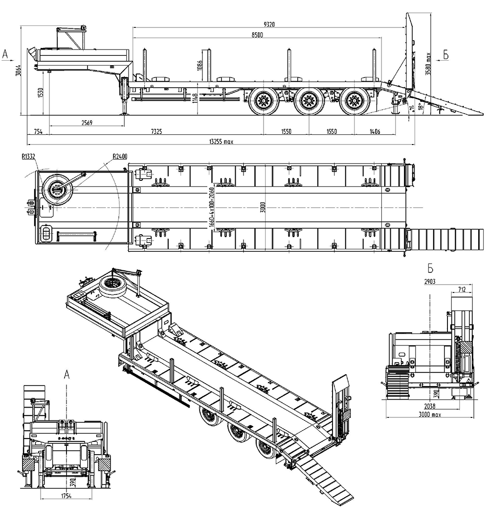 39000 кг, шины 385/65R22,5 или 445/65R22,5 / 6+1, платформа 11600 (по заднему свесу) x 2500 с уширителями до 3000 мм, приставные алюминиевые трапы, ССУ 1530 мм, пневматическая или рессорная подвеска, раздвижные коники 1500 мм, с бортами или без